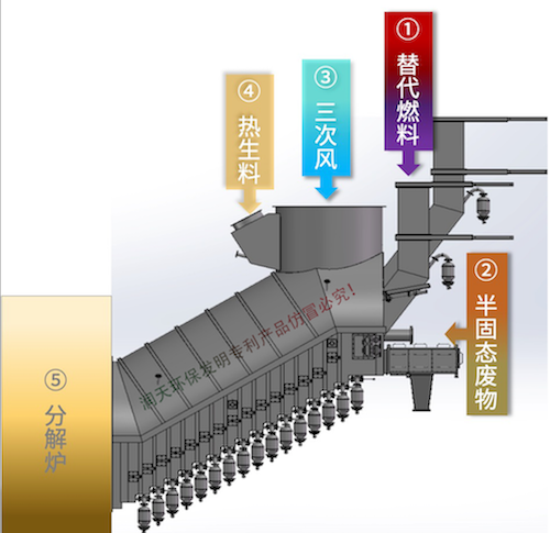 替代燃料、RDF、固態(tài)廢棄物從預(yù)燃爐尾部通過螺旋、溜槽、兩道翻版閥進(jìn)入爐內(nèi)。